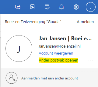 - Klik op de eerste letter van je naam rechtsboven, en klik op “Ander postvak openen” of “Open another mailbox” (afhankelijk van je taalinstellingen):