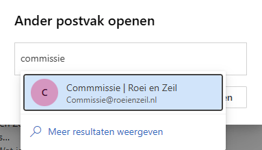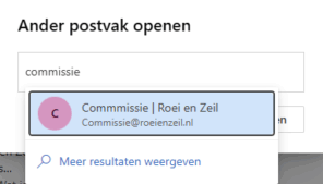 - Het is ook mogelijk om direct naar de mailbox te gaan met de volgende link, altijd inloggen met je persoonlijke account: https://outlook.office.com/mail/commissie@roeienzeil.nl/, waarbij commissie@roeienzeil natuurlijk moet worden vervangen door het adres dat je wilt bereiken.